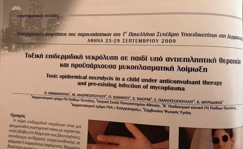 - «Τοξική επιδερμική νεκρόλυση σε παιδί υπό αντιεπιληπτική θεραπεία και προυπάρχουσα μυκοπλασματική λοίμωξη»